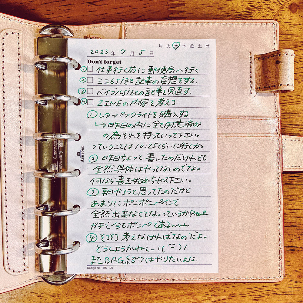 →TODOは細かいところまで書こうと思えばリフィル1枚くらい軽く使ってしまいそうですが、多く書き出せば書き出すほど、やれなかった時の中途半端な感じが入眠に支障をきたすような気がするので、本当に大事なことのみを書き出すようにしています。私の場合その日のうちに終わらせたい、または考えたいことは大体5つ以下に絞っているので、このリフィルが丁度良いです。