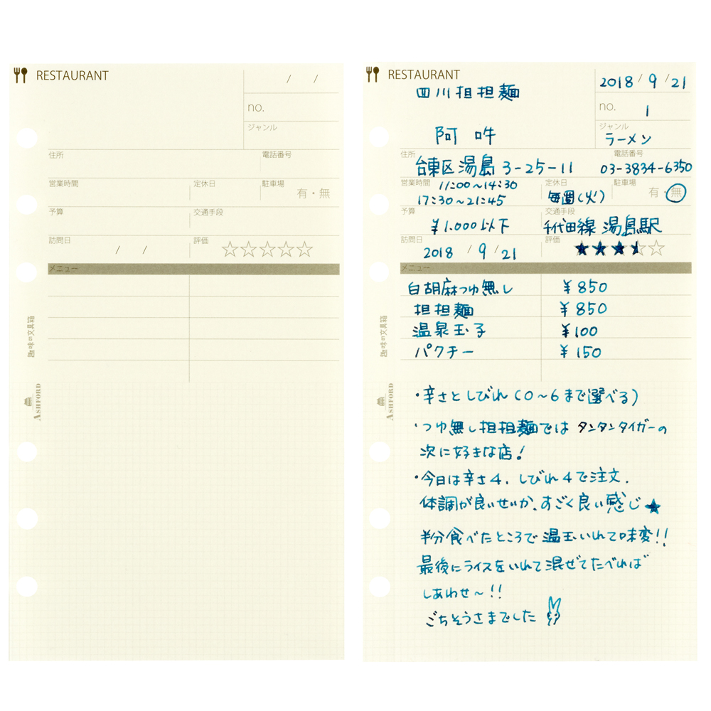 書き込んだレストランリフィルで、周りに美味しいお店を紹介したり、交換したりできるのも1枚ずつ編集できるシステム手帳ならではの楽しみ。