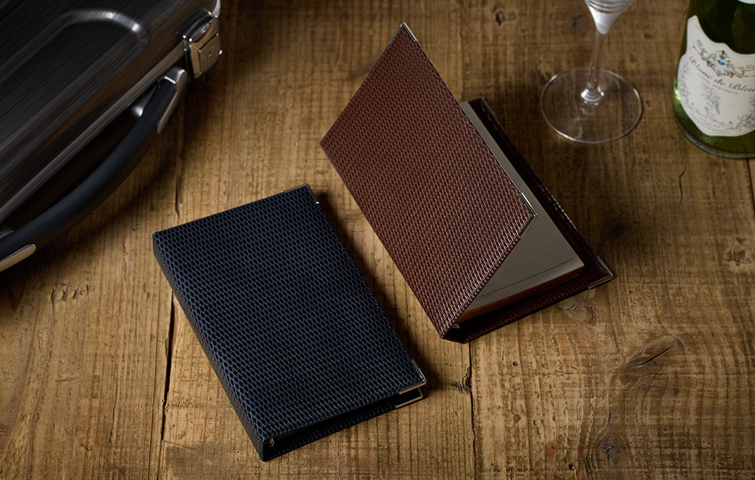 国産牛のタンニン鞣し革に、繊細なダイヤモンドパターンを型押ししたレザーは、 凛とした印象と傷への強さを兼ね備えた仕上がり。
