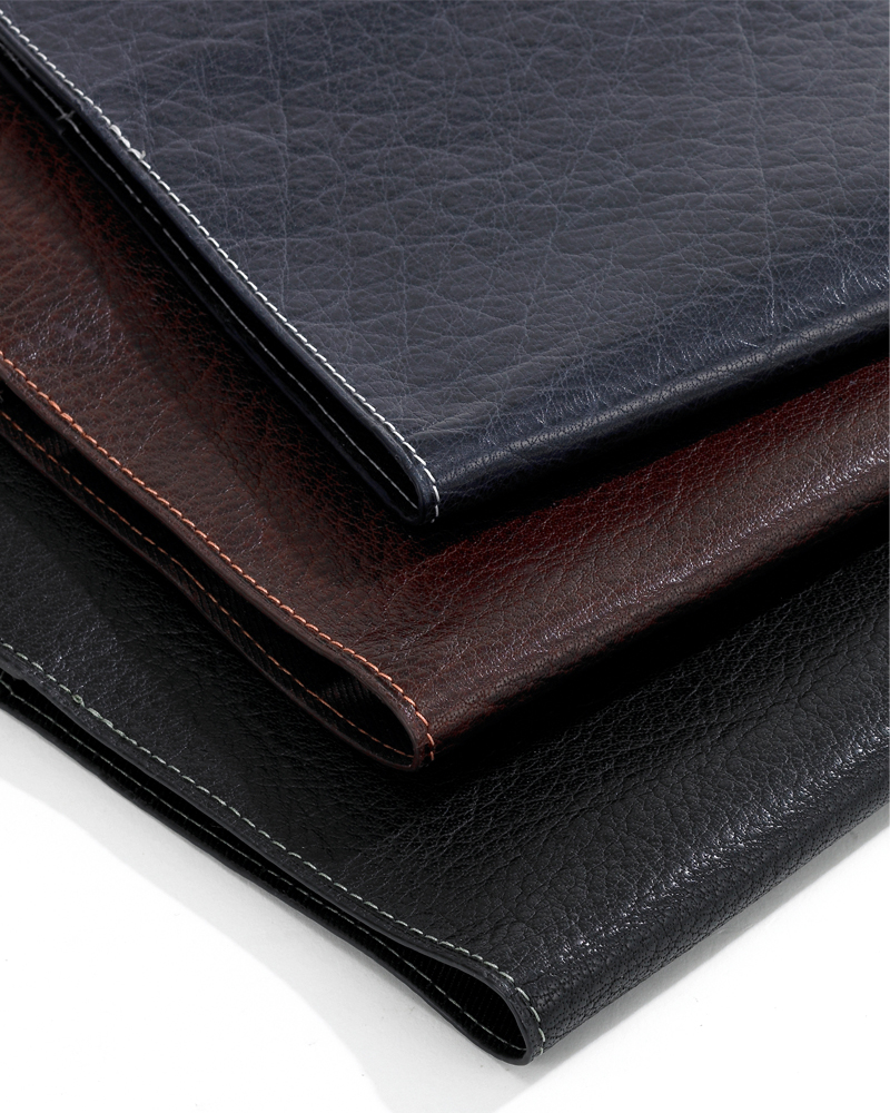 水牛革を使用し、普段使いしやすく、軽くて気軽に持ち運べるよう、革を薄くする工夫を凝らしました。目を引くステッチの遊び心がポイント。