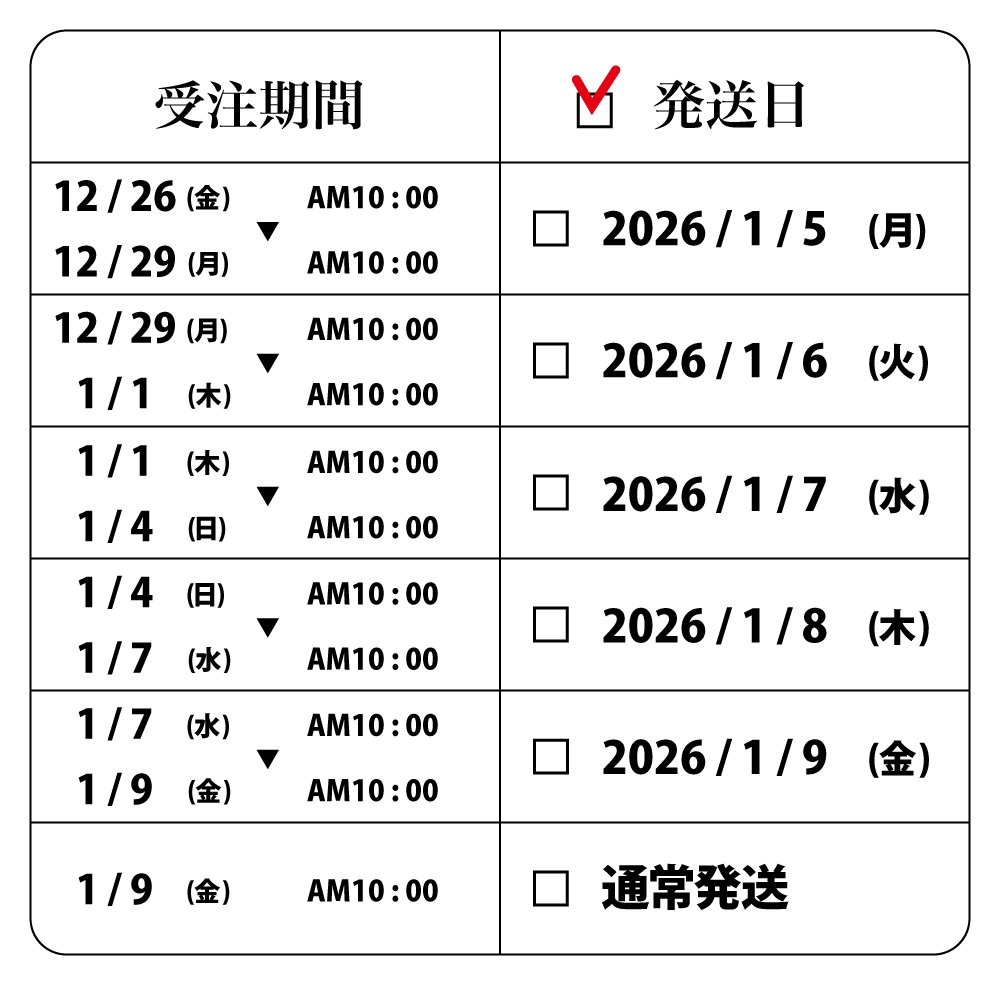 12月26日(金)午前10時までに承りましたご注文決済完了分につきましては、年内に発送させていただきます。