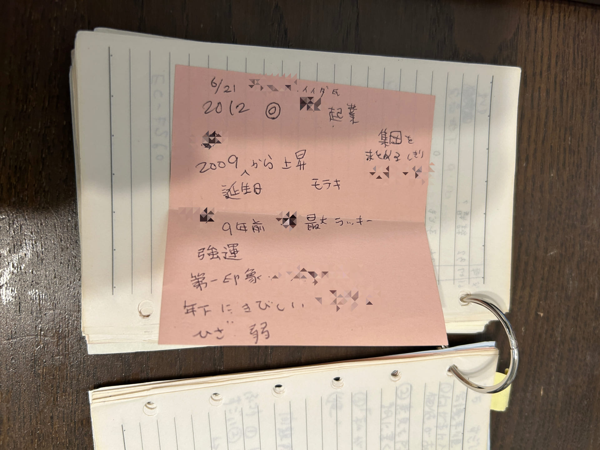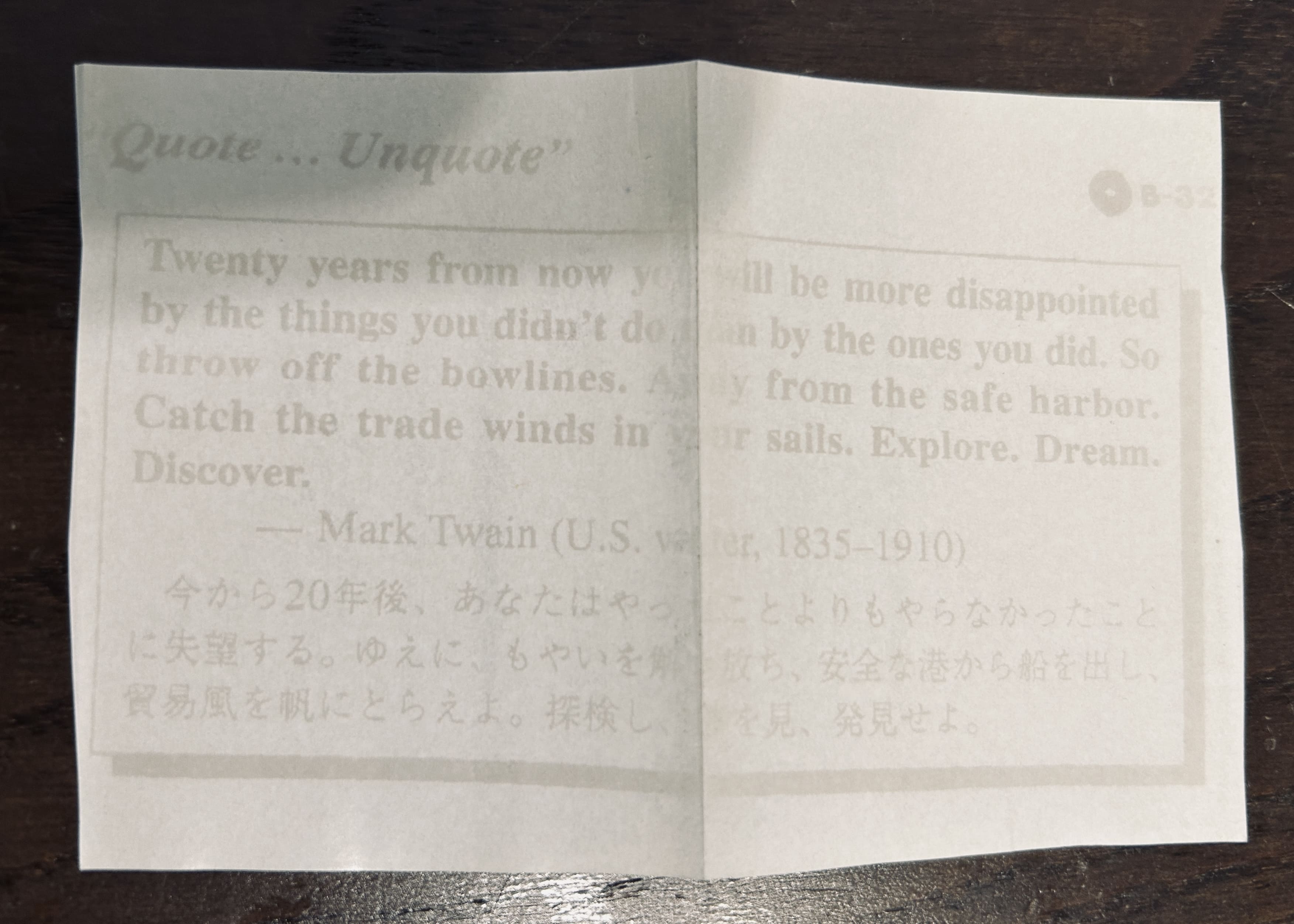 【上段】:占い師に占ってもらった時のメモ。【中段】:だいぶ色褪せてしまったけど大事にとってた偉人のことば「今から20年後、あなたはやったことよりもやらなかったことに失望する。ゆえにもやいを解き放ち、安全な港から船を出し、貿易風を帆にとらえよ。探検し、夢を見、発見せよ。(マーク・トウェイン)」切り抜いてシールドホルダーに挟んでいた。カフェを開業する力にもなっていた。【下段】:良さそうな音楽のメモ
