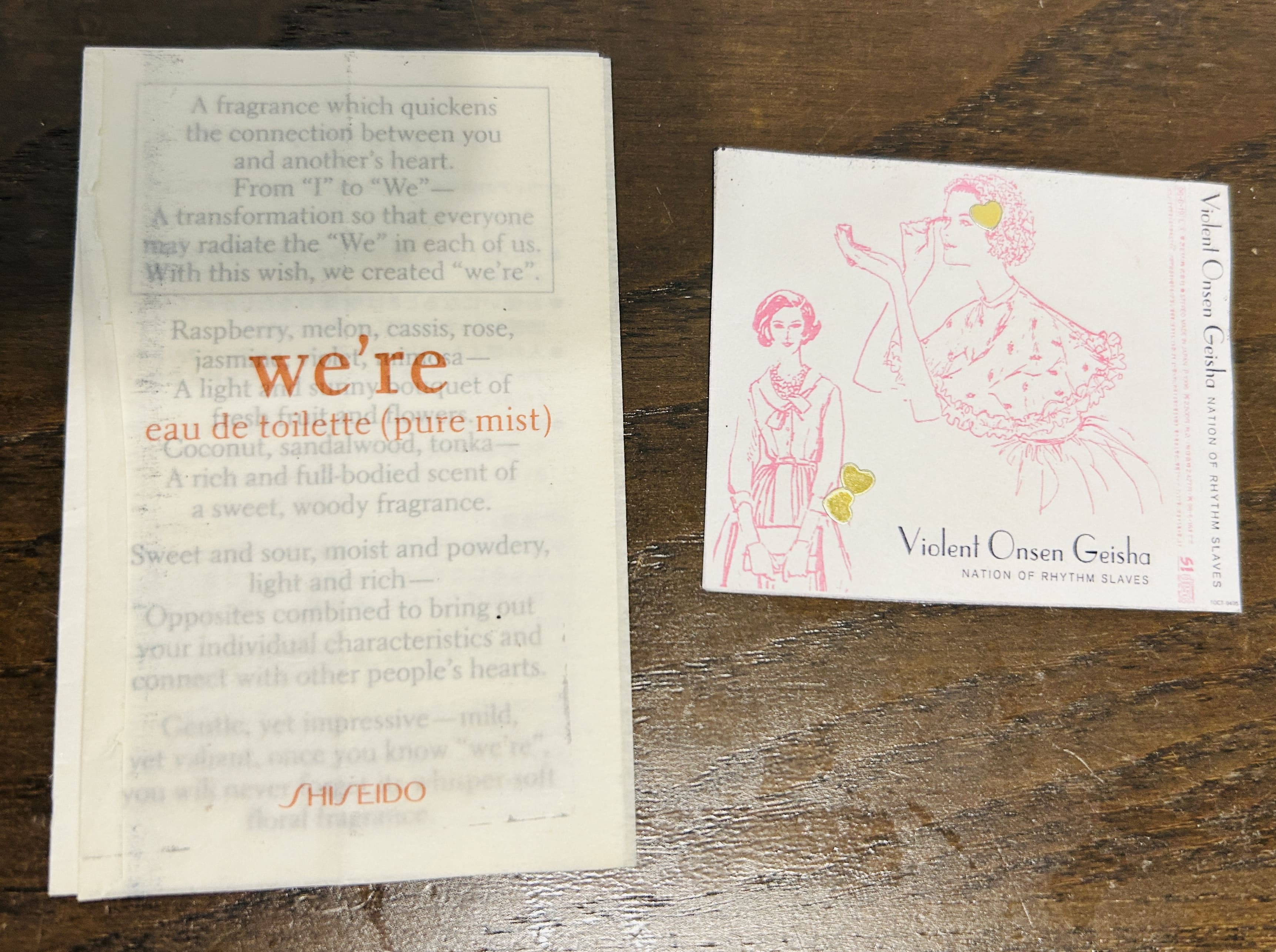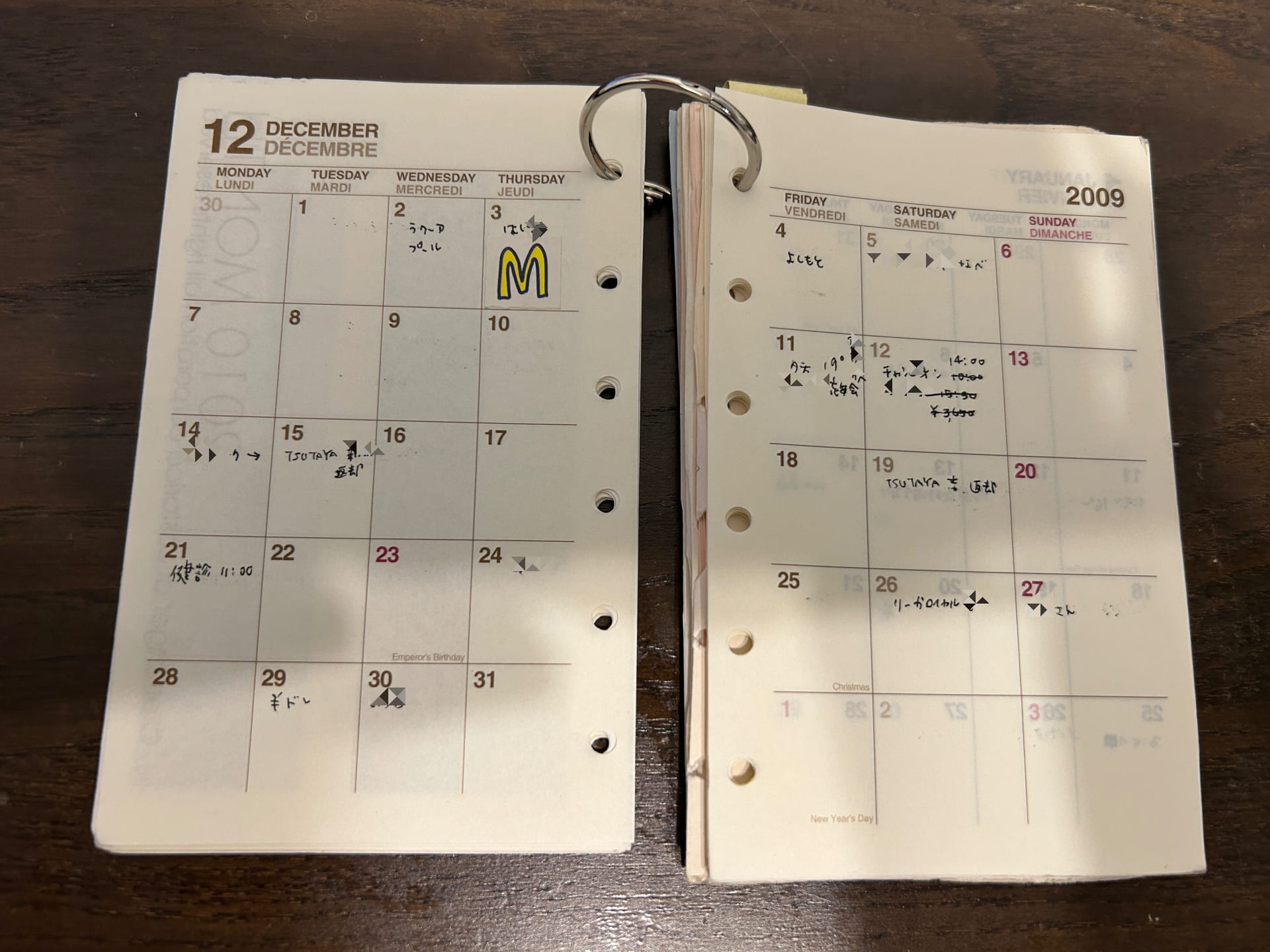 【上段】:2009年のカレンダー。(仕事は職場のオンラインカレンダー、プライベートは手帳だった)【中段】:気になった雑誌の切り抜きなどを手帳に糊で貼っていた。【下段】:気に入っていた資生堂のコロンのタグと好きなアルバムのジャケ写。