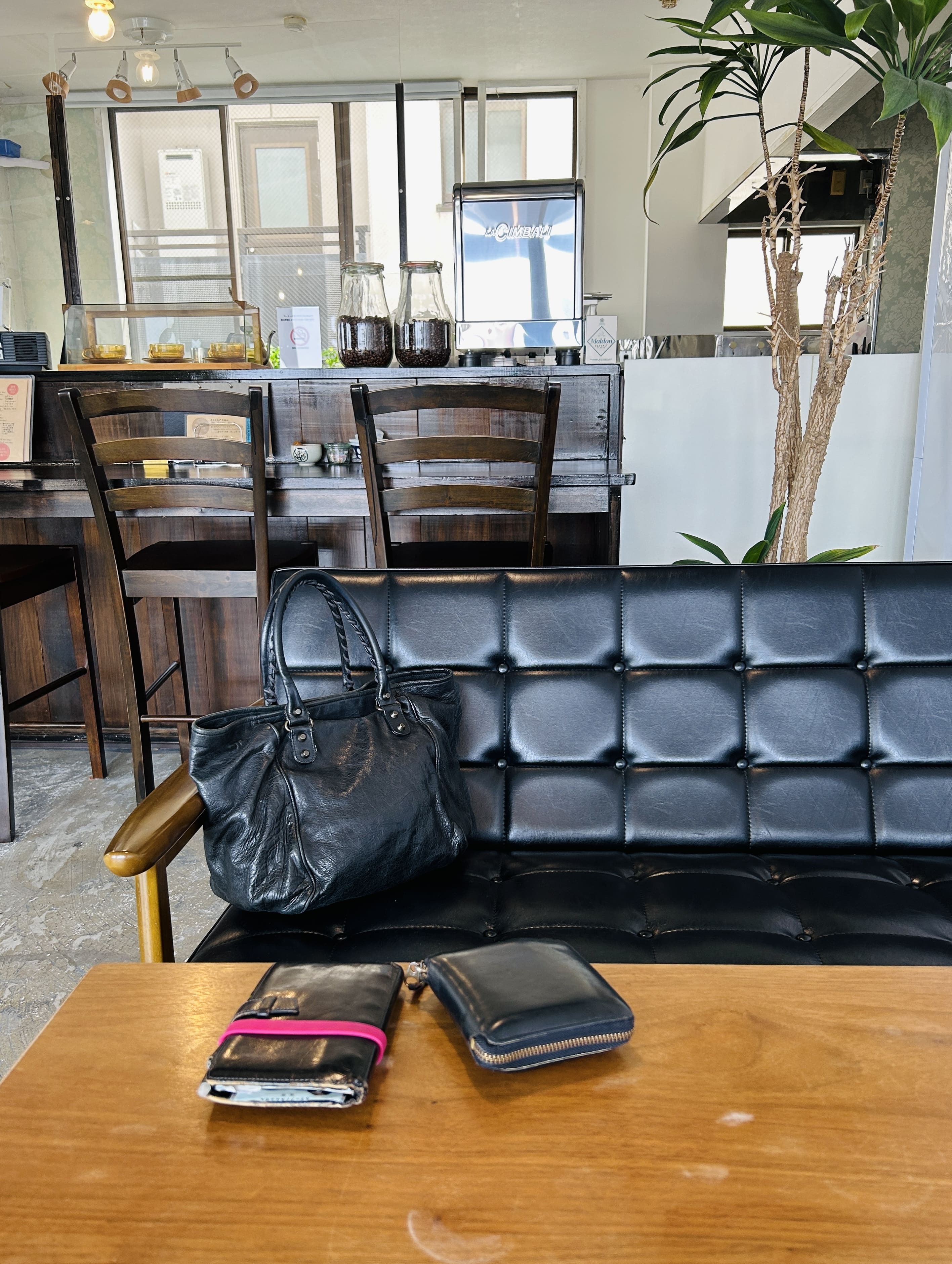 今も持っている黒い鞄、財布、手帳(弊店カフェで撮影 2026)