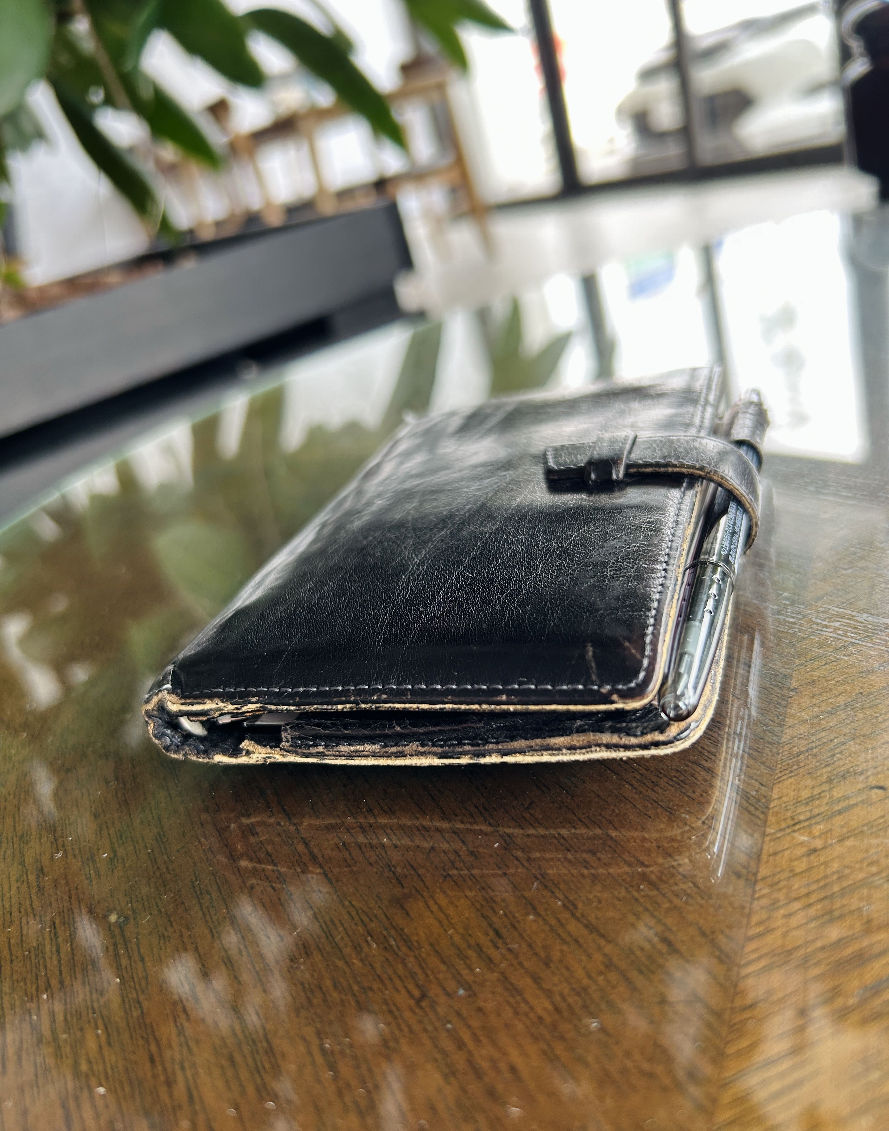 革の鞄、財布、手帳を全部黒で揃えて、鞄に財布と手帳をポンっと投げ入れ、出かける。これもまた私にとっての「小確幸」の一つ。 それにより角が剥げ、革も艶々に飴色になっていった。 飛行機での出張が多かったので、この手帳は何度空を飛んだのだろう。