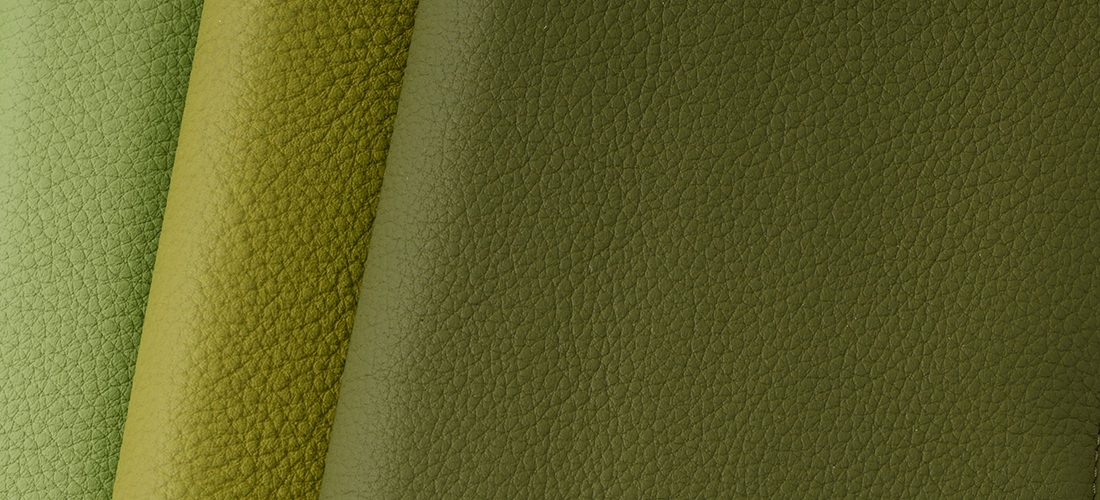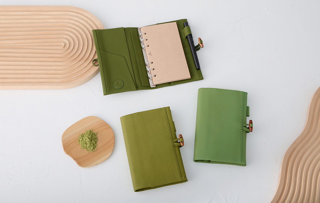 革に溶け込んだ抹茶がモダンに響き合う、 若竹、深緑、萌黄(もえぎ)と名付けられた3色の和グリーンの世界。