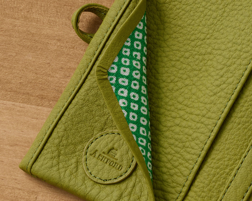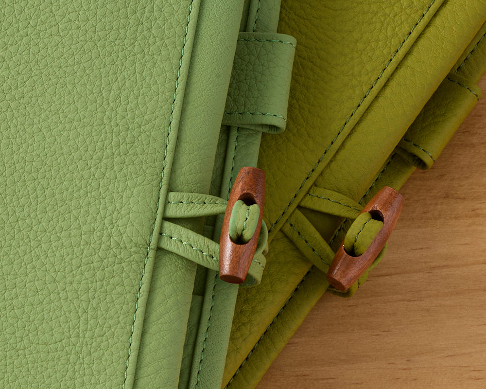革に溶け込んだ抹茶がモダンに響き合う、 若竹、深緑、萌黄(もえぎ)と名付けられた3色の和グリーンの世界。 たおやかな姿と形。瑞々しくしっとりとした面持ち。 手を触れると、波紋のように静寂が立ち上って来るよう。 一日のなかに、波風のない場所をひとつ。 そんな気持ちがやってきたら、開いてみる。 木のトグルがそっと、愉しげな予感を連れて来る。 こんなひとときはいかがでしょう。