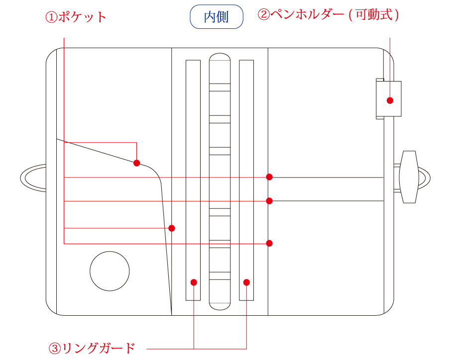 内側のあしらいは、白い丸模様が列をなしたちりめん友禅の布地。小さな豆皿が並ぶような、ほっこり感も。 手仕事のぬくもりと手ざわり、そして目にもやさしく。箸休めならぬ、筆休めに。ふと手を伸ばしたときにあらわれる、静かな癒しの風景。ロゴの丸革もアクセントに。サイズ・仕様