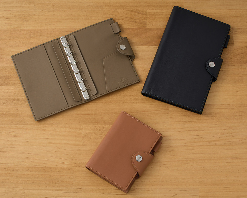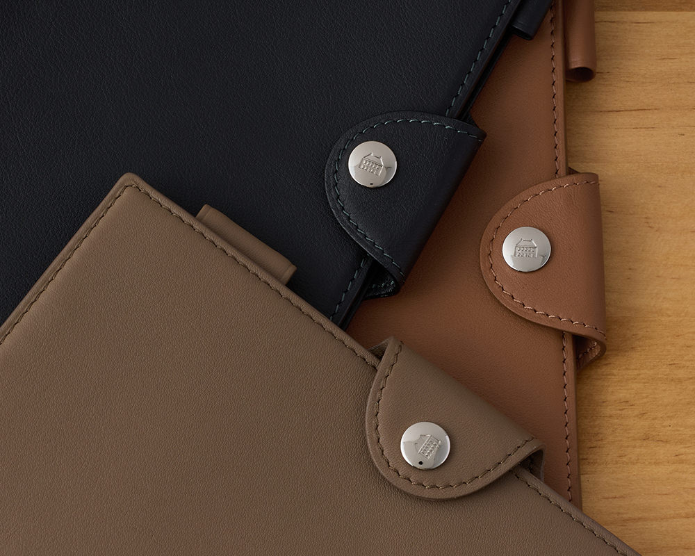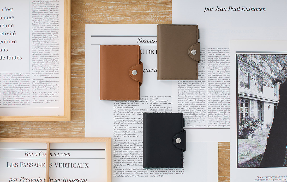カラーとサイズは3種類ずつ展開。ブラックは重くなりすぎないカラーでの仕上がり、現在ヨーロッパで流行のキャメル、エレガントなトープで、MICRO5 11mm、MINI6 11mm、BIBLE15mmサイズで革の雰囲気を生かした使ってみやすい薄さの手帳になっています。書くひとを、そっと支える形。