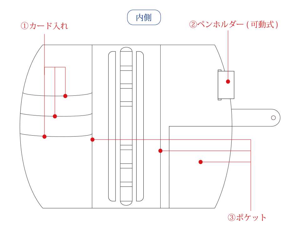 よくある手帳の直線とは違う、流れるような曲線フォルム。