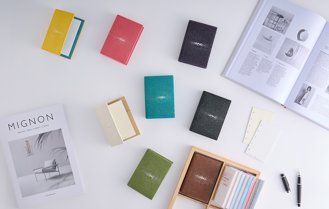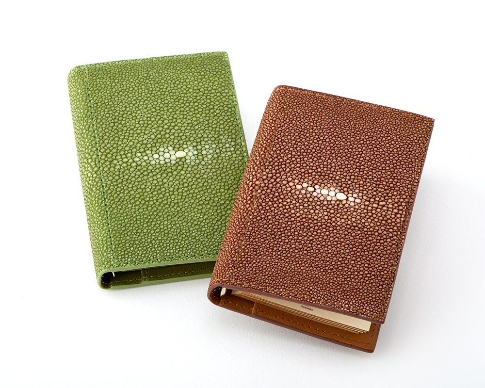スマートでさりげなくラグジュアリー、 手に入れた人にしか体感することのできない深い満足感がここに。 光を受けると表面が宝石のように煌めき、とてもゴージャス。 ガルーシャと呼ばれるエイ革の歴史は古く、その美しさと堅牢さで中世の頃から装飾に使われてきました。 ハードな質感とビーズを並べたような天然の輝きが印象的。 なかでも表紙中央に大胆に配置された神秘の煌めきに目を奪われます。