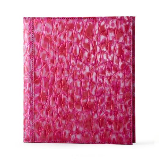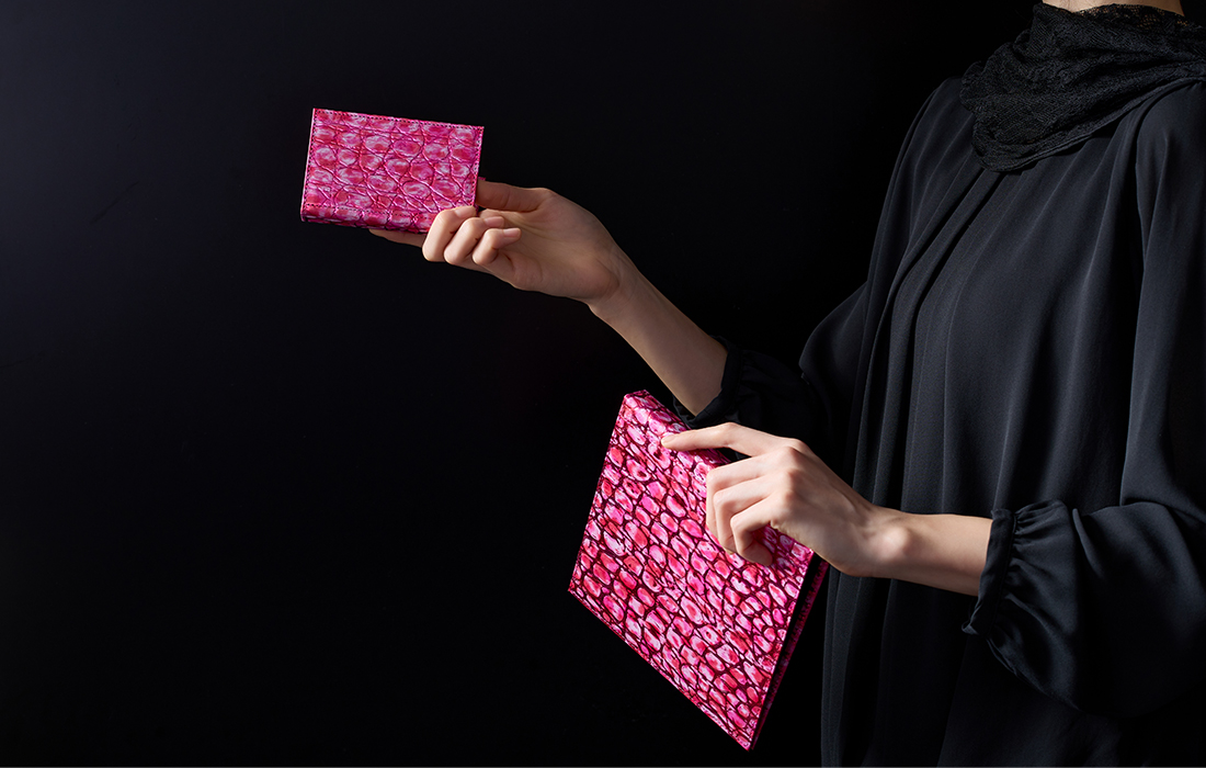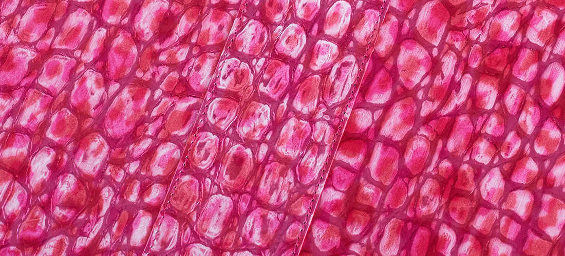大きめのクロコダイルを型押しした牛革に、濃淡の異なる数色のピンク染料を重ね、さらに箔を押し込む。その上から染料と箔をアーティスティックに一気に落とすことで、凹部にはきらめきが残り、膨らみのある部分には鮮やかな色が浮かび上がる。