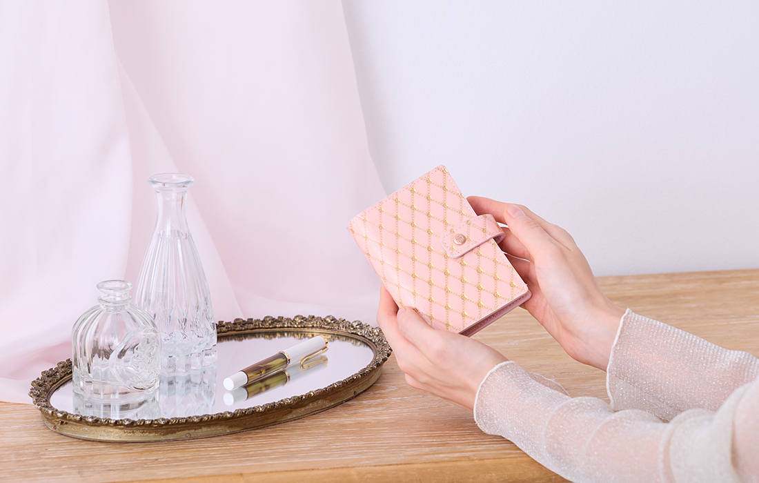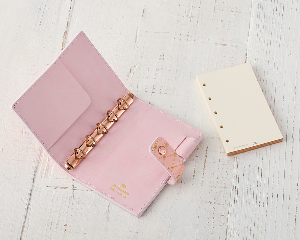内装には、名門イタリア・ファエダ社のキズのつきにくいソフトレザー。柔らかくニュアンスのある大人のピンクがお出迎え。表紙のラブリーさを受け止め、心沸き立つ気持ちをキープし続けてくれるマリアージュです。