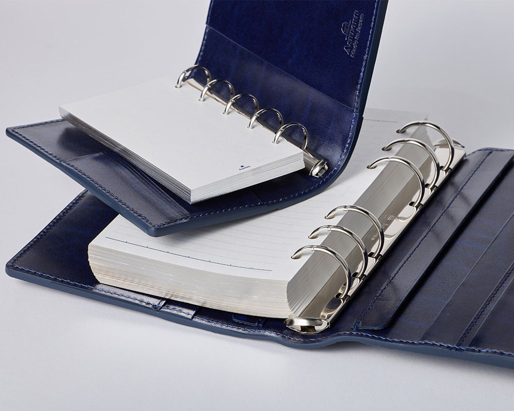 MICRO5は17mm100枚収納。BIBLEは25mm約200枚収納可能。ダイアリーやメモの他、収納系リフィルも楽々入り自分に使いやすい、手帳の中身へとストレスなくカスタマイズできます。17mmのリングは日本での受注生産を行う希少なリングで、スムーズなめくりが特徴です。